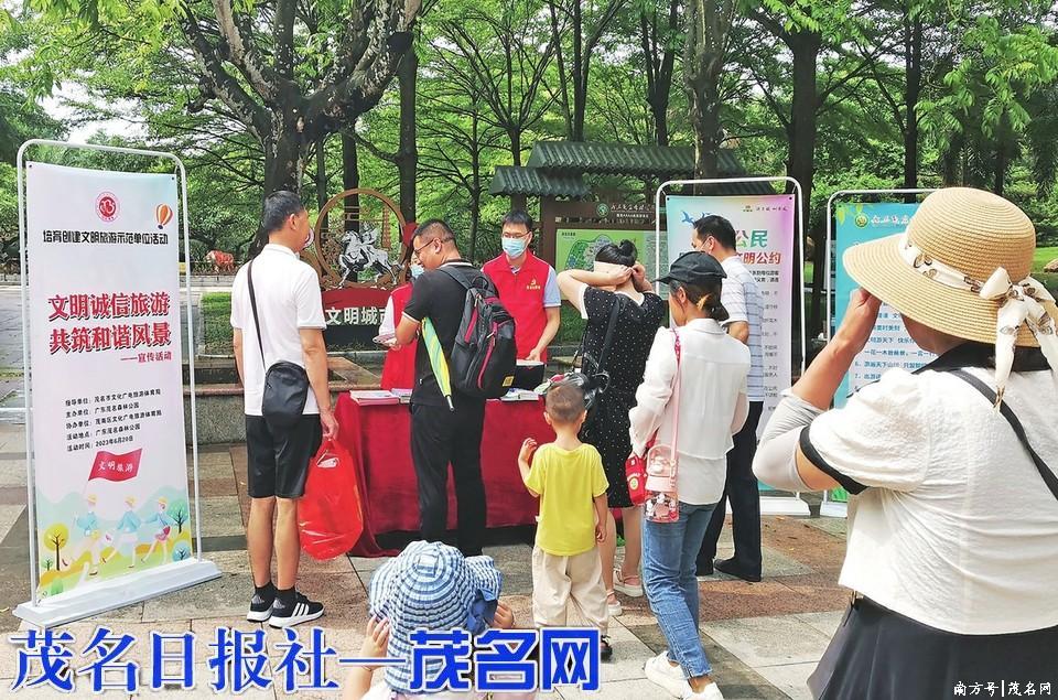 广东茂名丛林公园职责主谈主员向旅客宣传斯文诚信旅游的联系实质。 茂名日报社全媒体记者 岑稳 摄